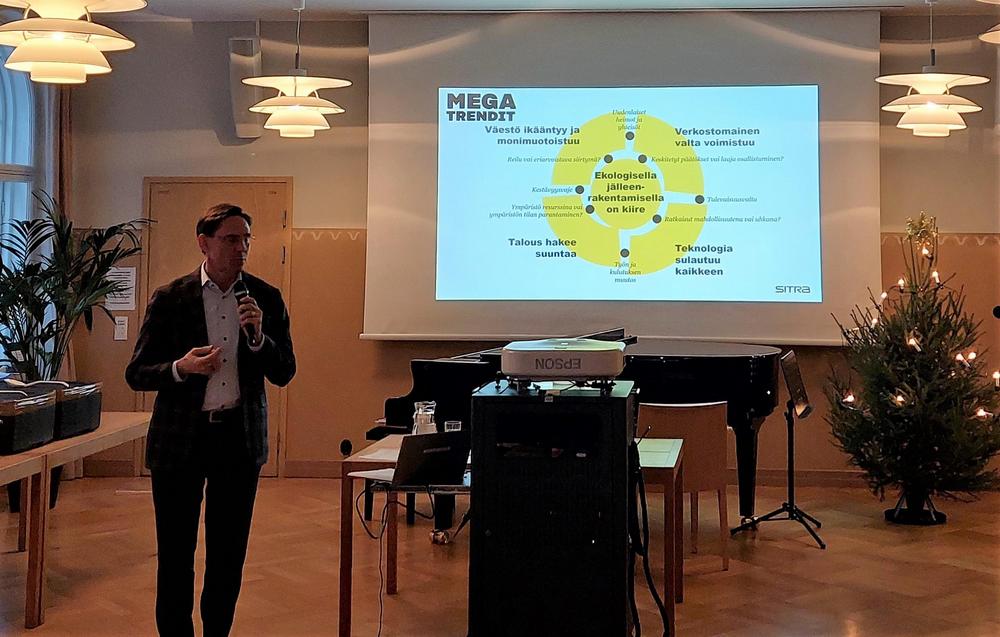 Kuulimme Sitran tulevaisuustyöstä, johon kuuluvat mm. tutkimukset, selvitykset, ennakoivan tiedon tuottaminen päättäjien, yritysten ja yksilöiden käyttöön, tapahtumat, koulutus ja verkostoituminen. Antoisan esityksen jälkeen vakuutuimme siitä, että Sitra on menestyvän Suomen sillanrakentaja.